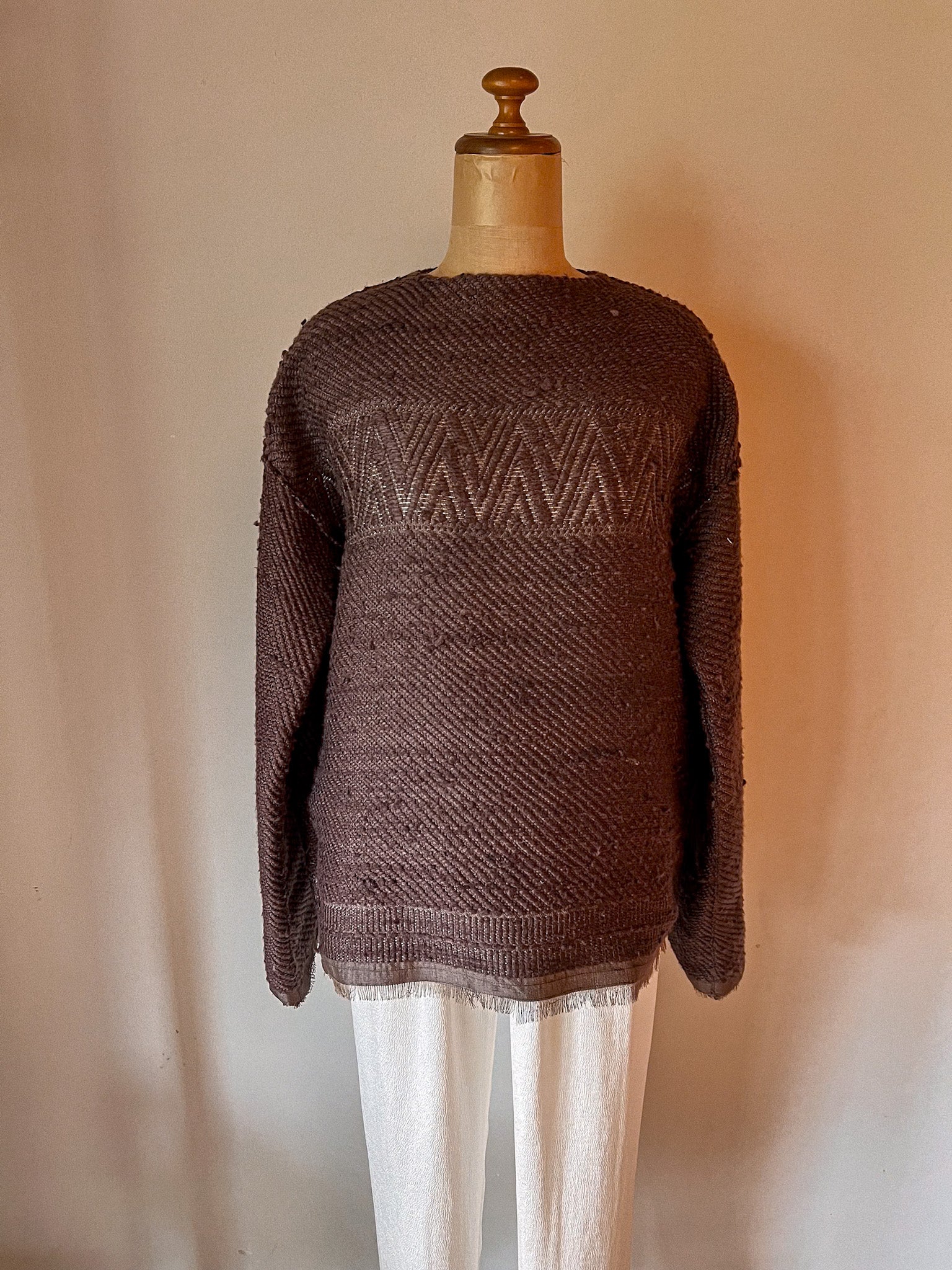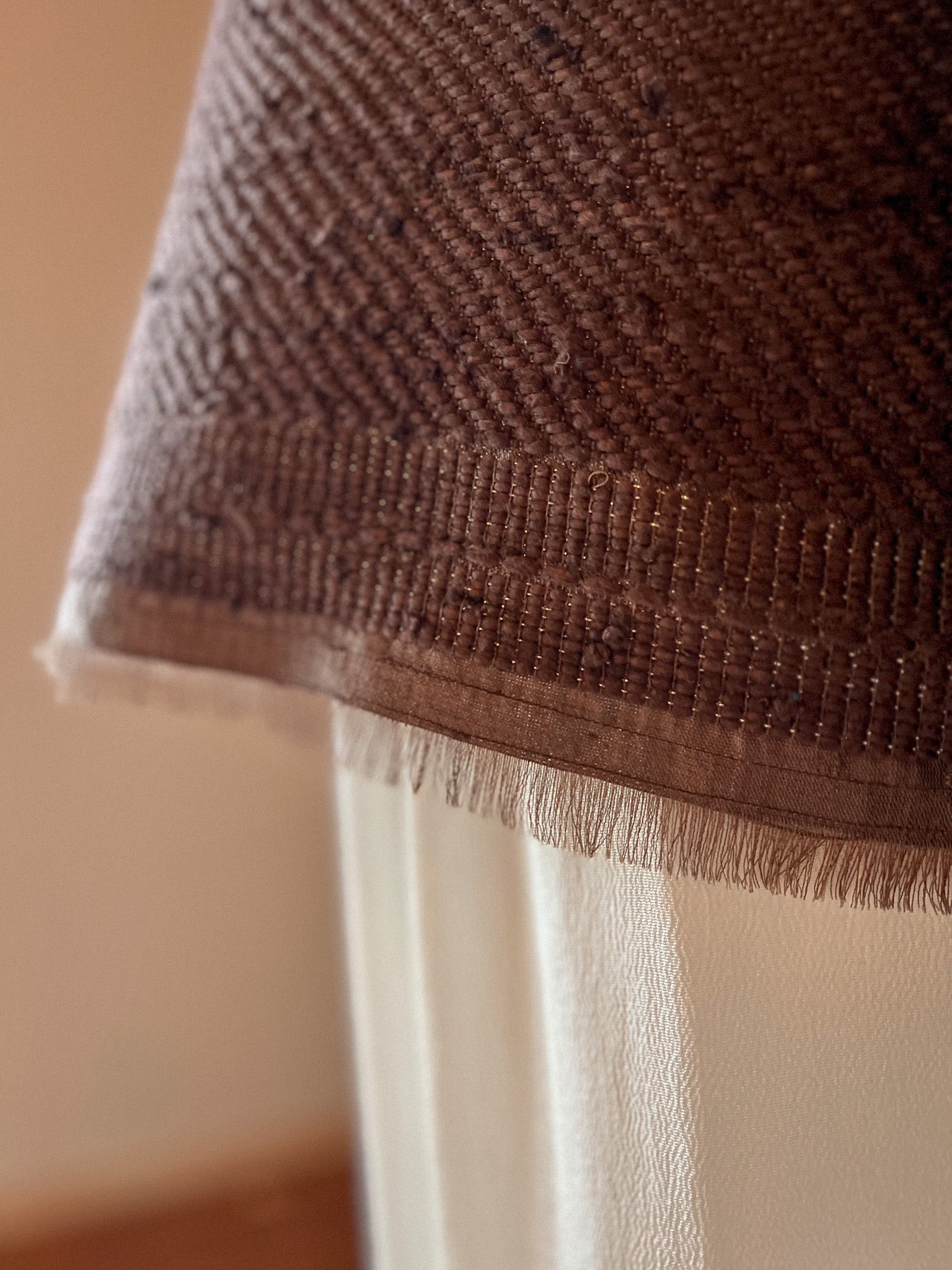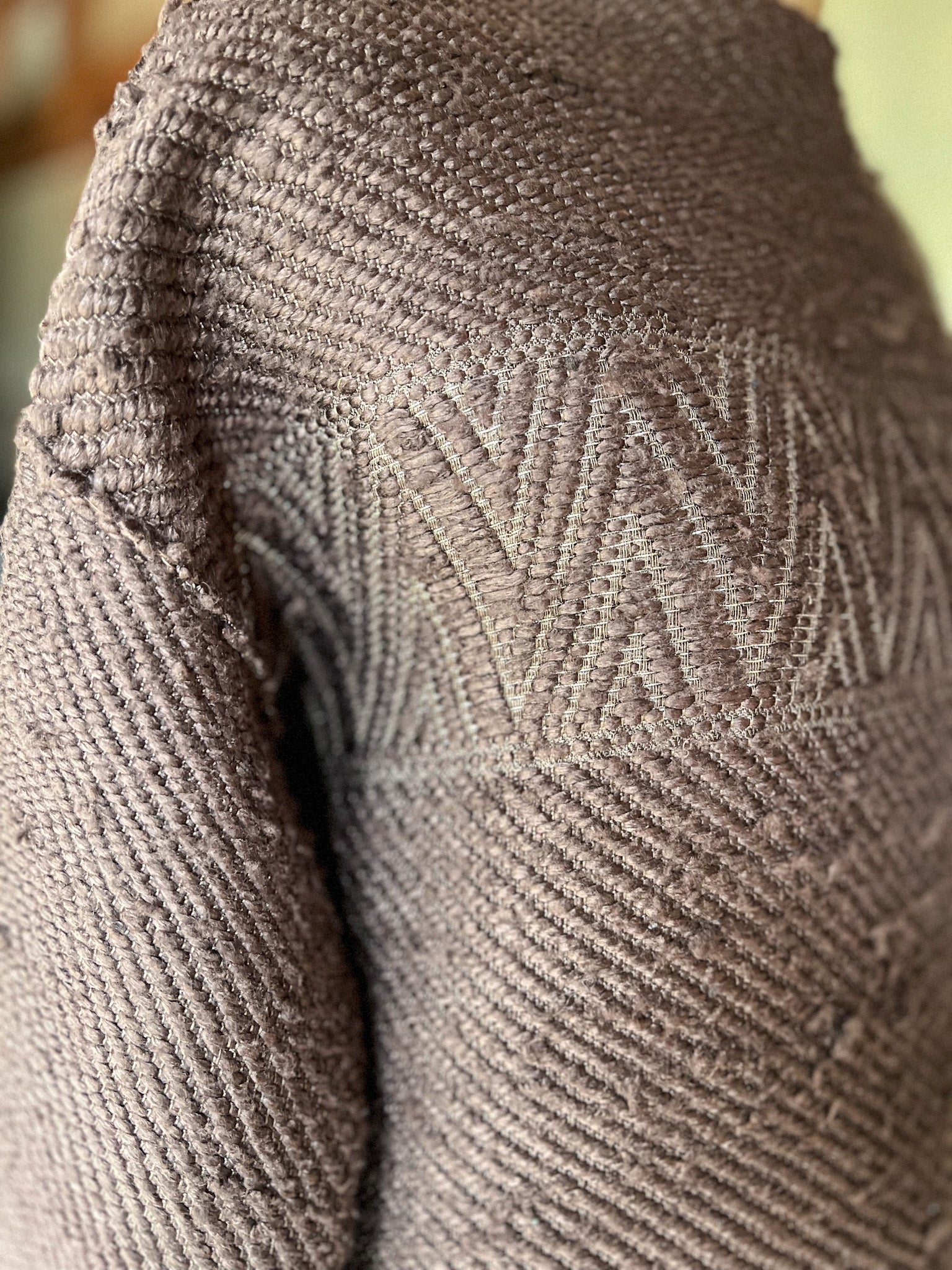 The Story:丹後の工房で織り上げられたのは、相反する要素を孕んだ一着です。 岩肌のような荒々しい凹凸と、内側から発光するような濡れた艶。